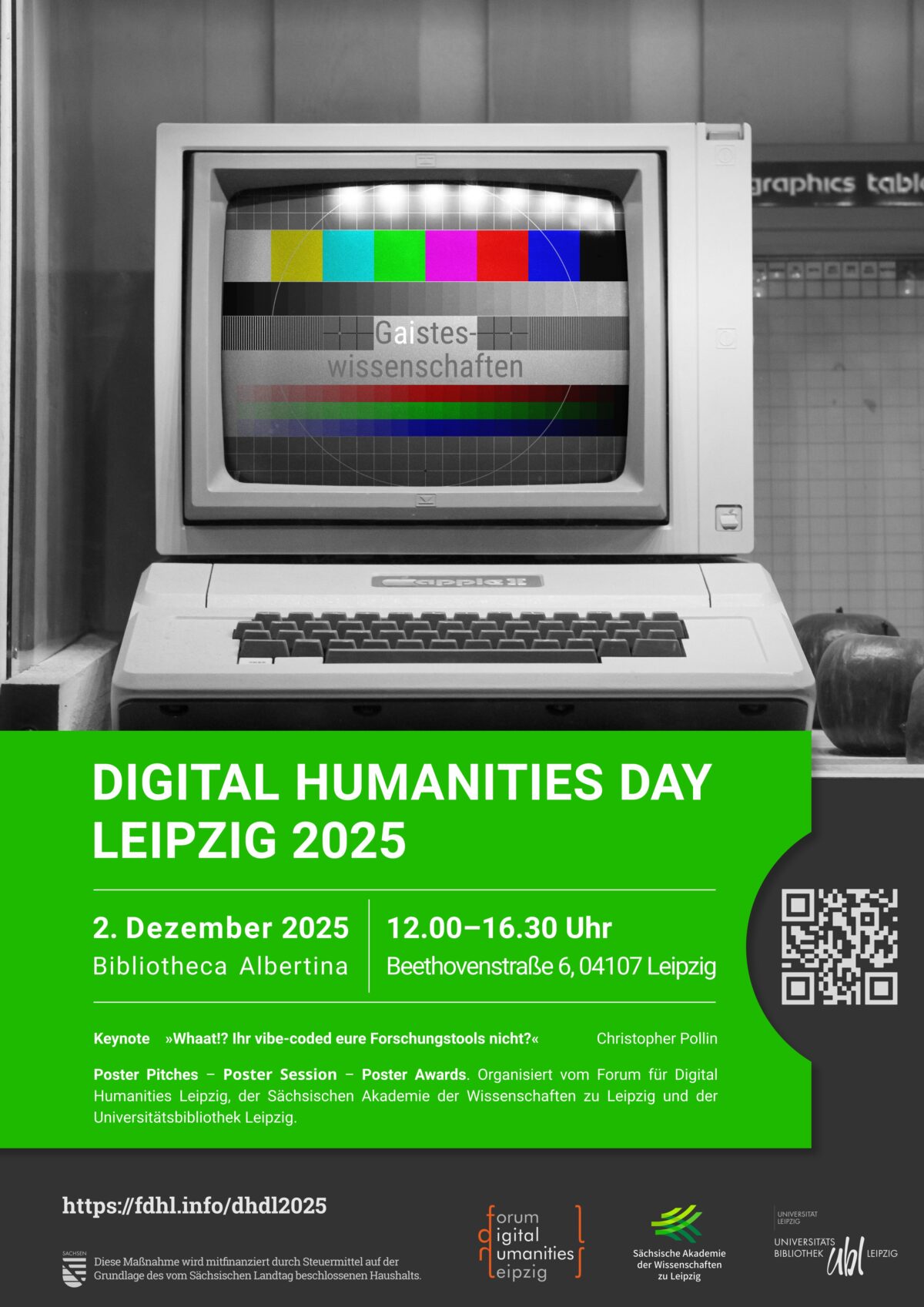 Der Digital Humanities Day Leipzig 2025 (DHDL25) findet am Dies Academicus in der Bibliotheca Albertina statt und widmet sich schwerpunktmäßig dem Thema Künstliche Intelligenz in den Digital Humanities.
